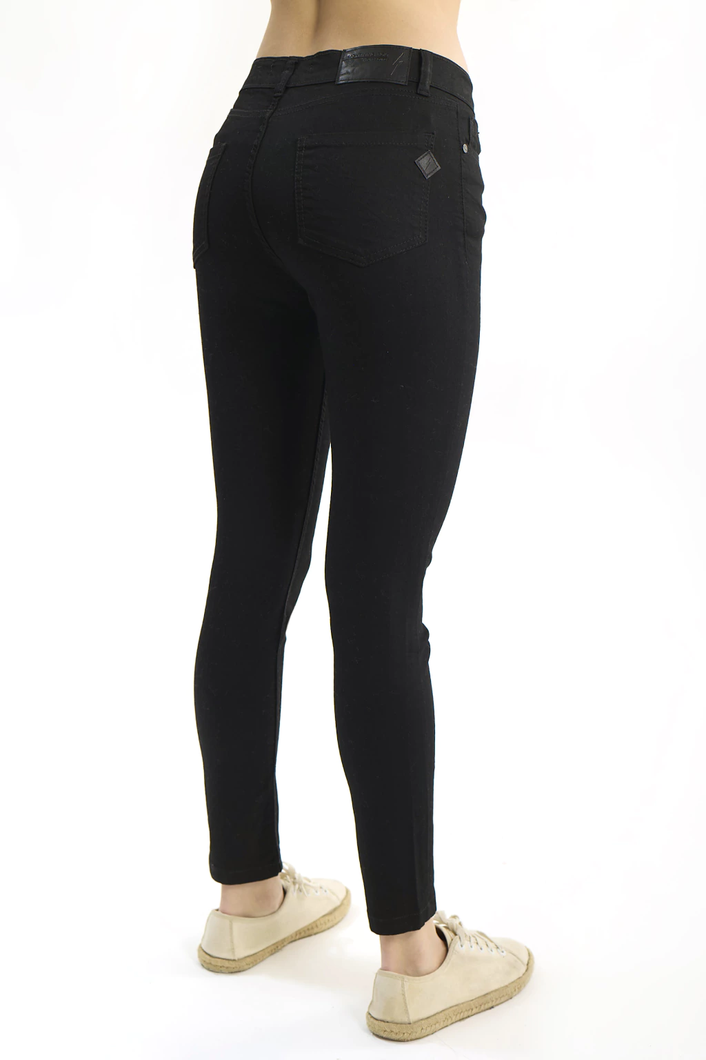 Denim elastizado negro. Tiro medio, calce SKINNY. Hilo y avíos a tono.