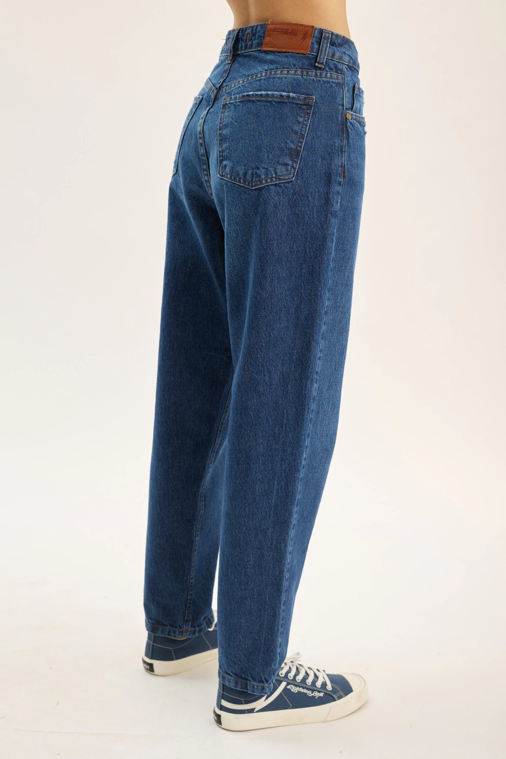 Denim rígido, 100% algodón. Look vintage, roturas en bolsillo. Calce MOM. Hilo a contratono, avíos y marcario metálicos.
